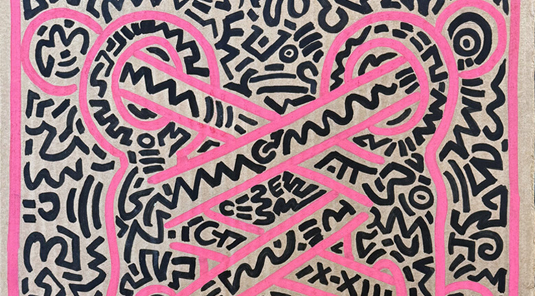 This Untitled work from 1985 dates from a moment when Keith Haring’s visual language was fully articulated and widely recognized. Executed on cardboard, this unique piece draws directly from the vocabulary established through his subway drawings: bold black outlines, saturated color, and figures locked in rhythmic interaction. The use of an everyday support reinforces the immediacy of the gesture and situates the work firmly within the urban context of 1980s New York. This piece is closely aligned with Haring’s practice during the mid-1980s, when his imagery circulated fluidly between the street, the studio, and the exhibition space.